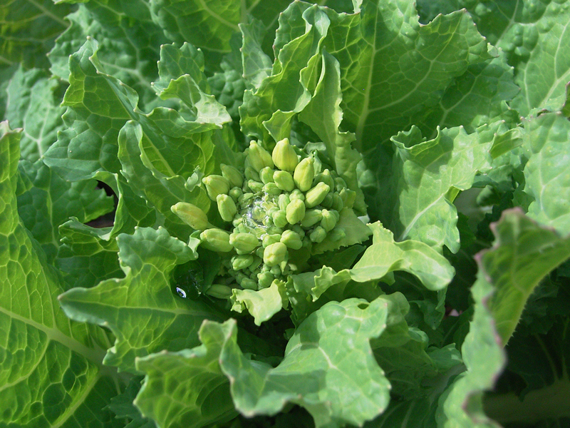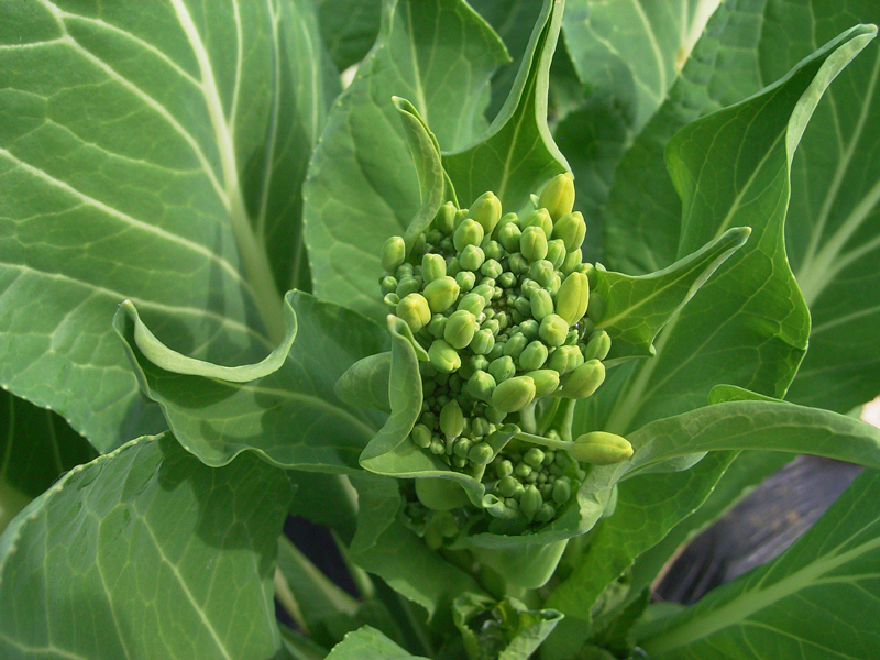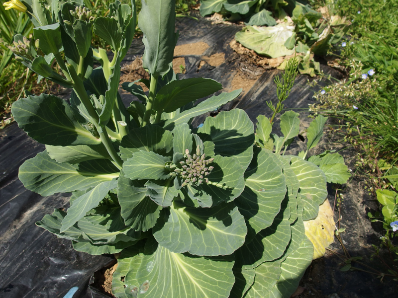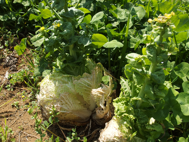 市販されている菜花のように、菜花専用の品種もあるのですが、秋に種を播いて冬を越した小松菜やキャベツ白菜を全部収穫しないで、そのまま畑に置いておくと菜花が出て来てくるのを、伊豆に来て初めて知りました。