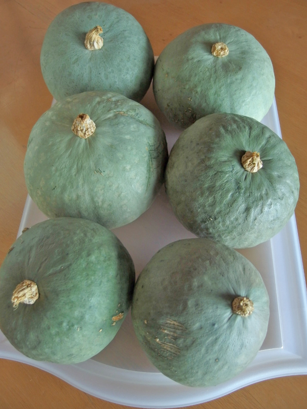 悪天候や盗難をまぬがれて収穫できた今年のカボチャ、貴重品です。今年は昨年の失敗を繰り返さないようにF1カボチャのこの「雪化粧」の種は、全て買ったものです。なので昨年のように色々な形のカボチャが出来るような事はなく、全部丸くて白い「雪化粧」となりました。バンザ~イ、でも昨年のように色とりどりも楽しかった気もします。