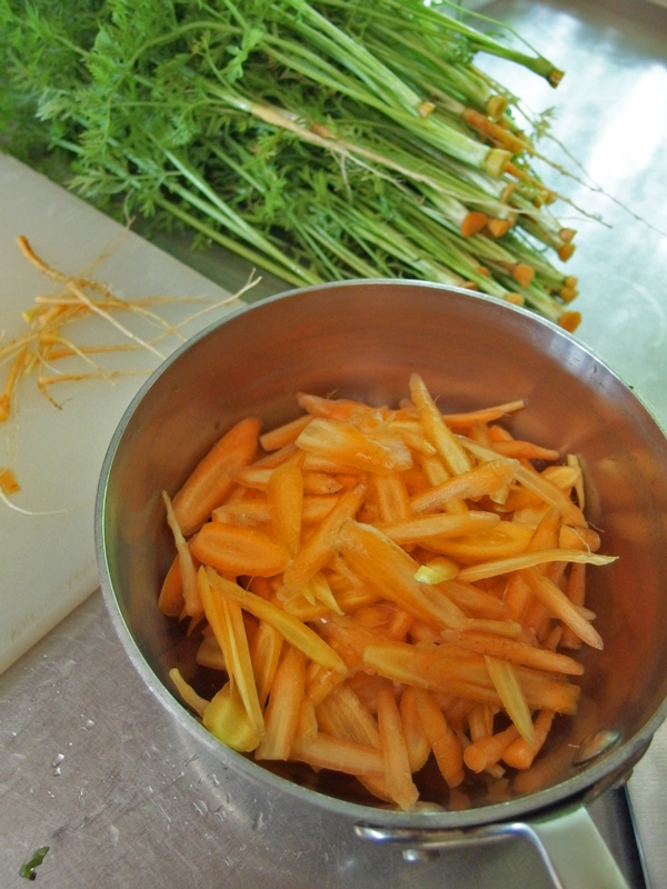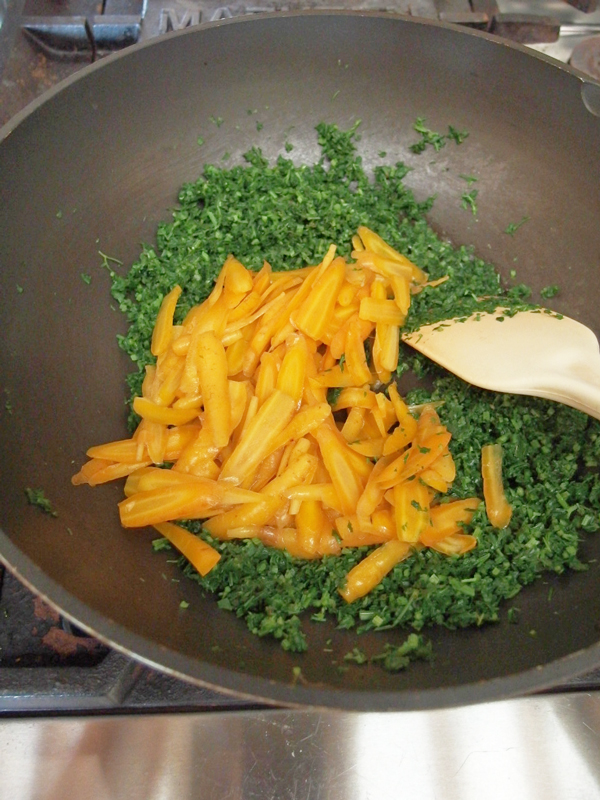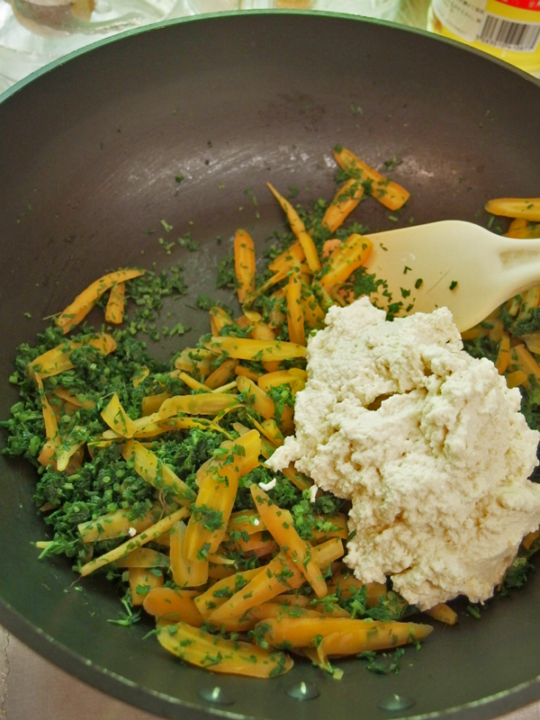間引きした赤ちゃん人参の、フサフサとした香りのよい葉っぱと可愛らしいオレンジ色の根、この両方を一緒に味わう方法はないかしら?あれこれ考えてこの時は「人参の白和え」を作る事にしました。