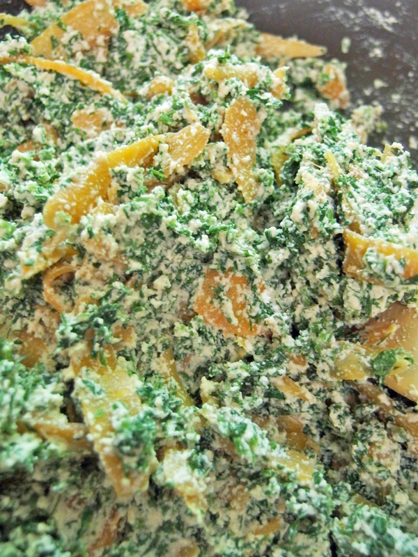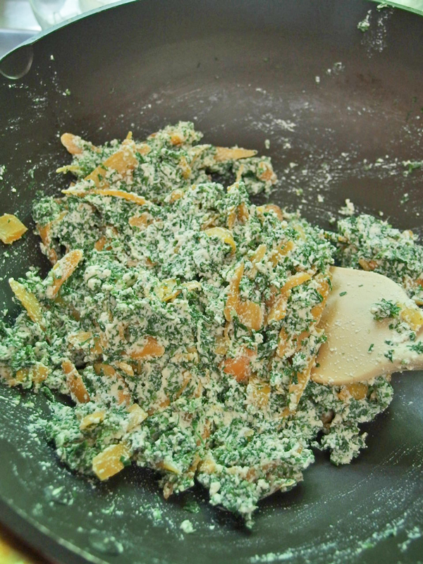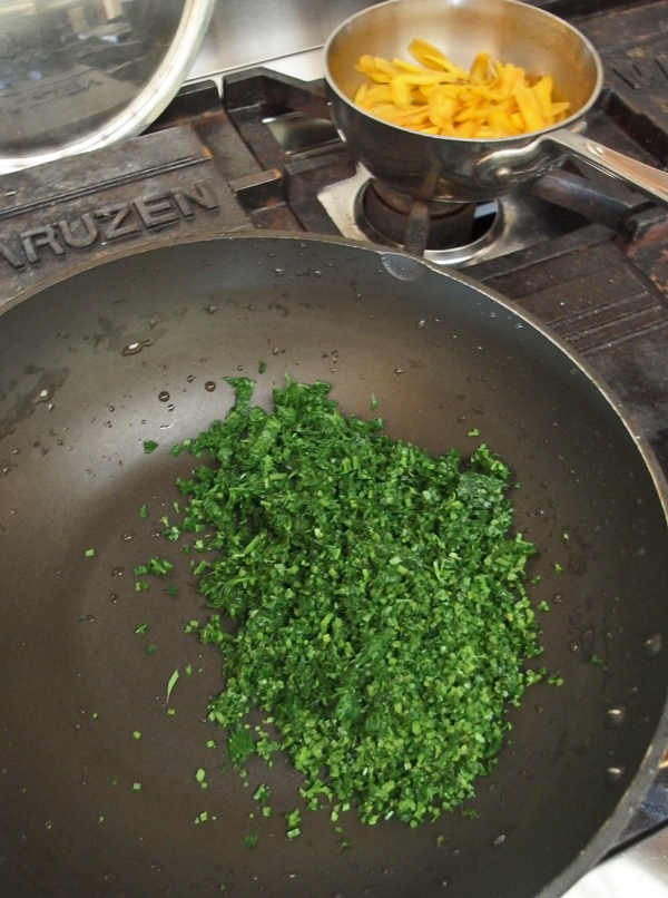 ③ 葉は塩を入れた熱湯で茹で、冷水にとり、しっかり絞ってからみじん切りにする。これを鍋に入れ塩をふって空炒りし冷ます。