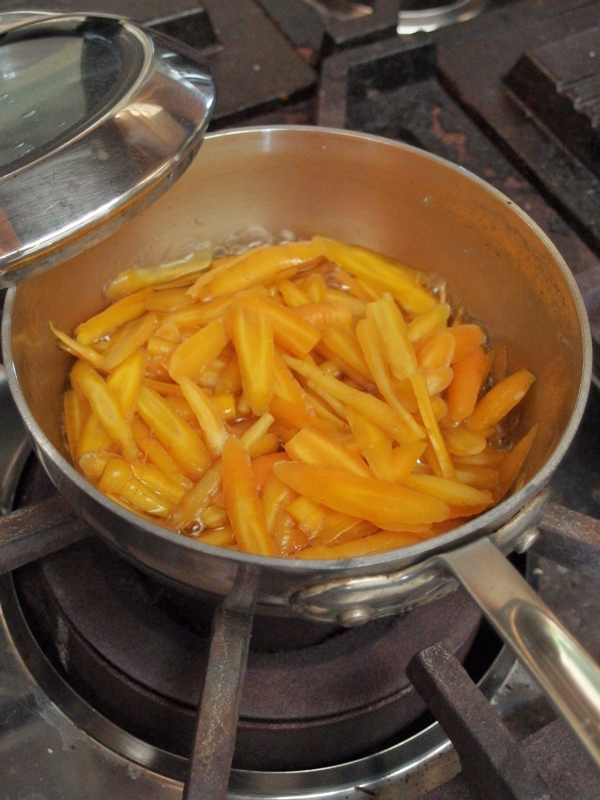 水をヒタヒタより少なめに入れて火にかけ、9分通り柔らかくなったらダシ醤油を入れ、ちょっと煮て火から下して冷まして置きます。