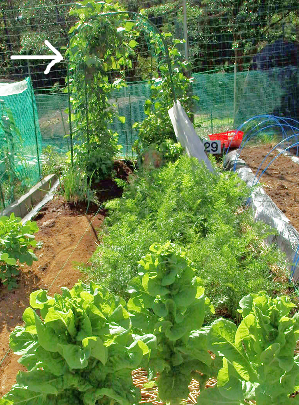 アーチ状の支柱の左側がインゲン、アーチの右半分は胡瓜。インゲンと胡瓜で覆われたアーチの下には青紫蘇が植えてあります。日陰に植えた青紫蘇は葉が柔らくて美味しいのです。
