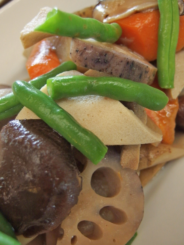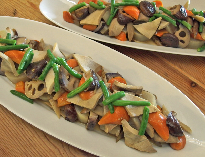 野菜の皮をむかないで、アクもとらないで、野菜をなるべく丸ごと使うマクロビオティックの「お煮しめ」です。