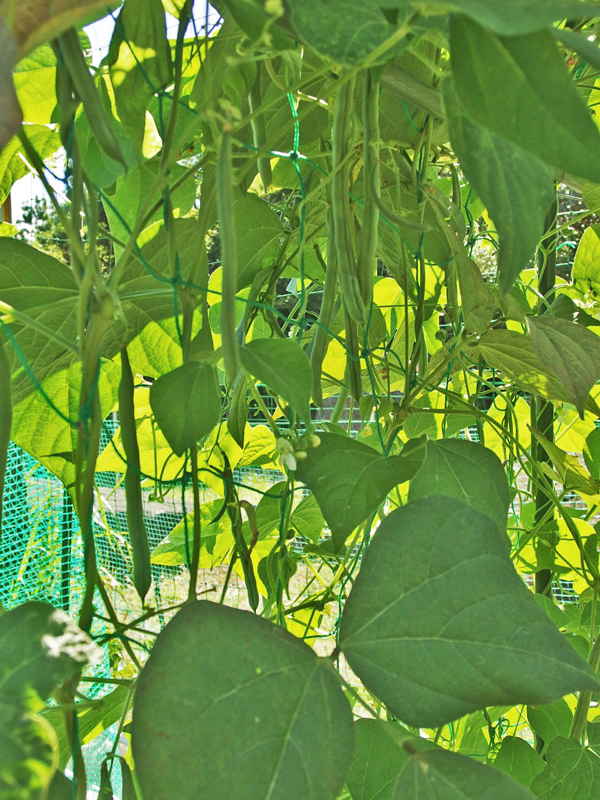 真夏の日差しの下、ブラブラぶら下がったインゲン、見ているだけでのんびり幸せな気分になってきます。