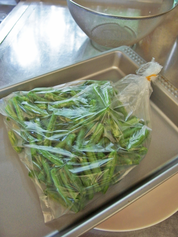 使う時は、凍ったまま使います。シチューのように他の野菜と一緒に煮込むときは鍋にそのまま入れればよいし、バジルペーストのパスタに使う時は凍ったままパスタと一緒に茹でます。インゲンだけを単独に使う時は、濃いめの塩水で茹でます。