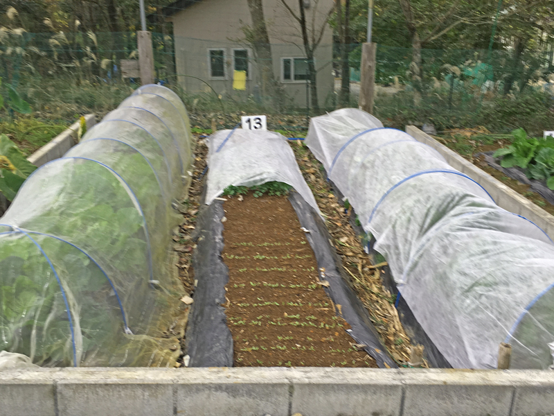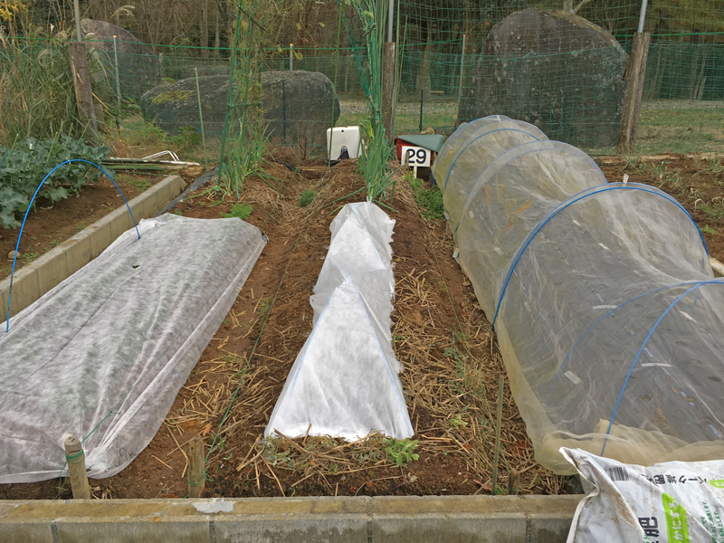 冷え込みが普通でなかったので、上の畑の野菜が心配になりました。それで野菜に大急ぎで不織布をかけに行きました。