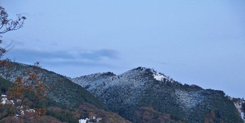 翌朝、晴れて見えるようになった向かいの山には、未だ雪が残っていました。