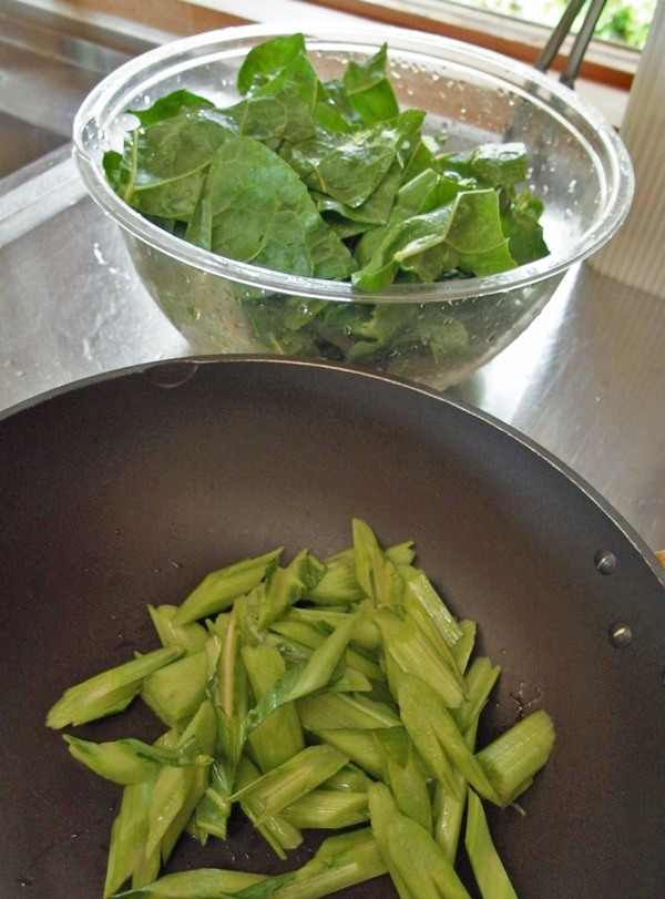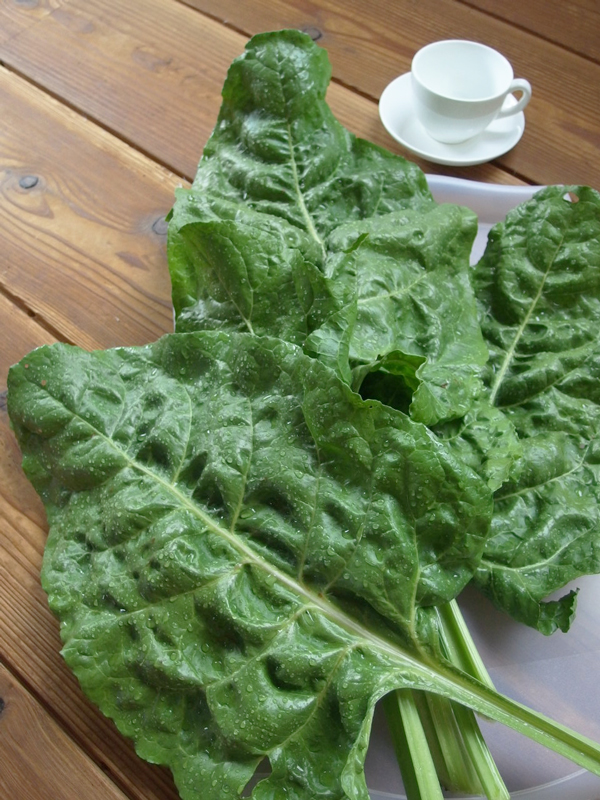 それで郵便局へ行った帰り道、下の畑へ寄って、先日見つけたスイスチャード=ふだん草を何枚か採って帰りました。