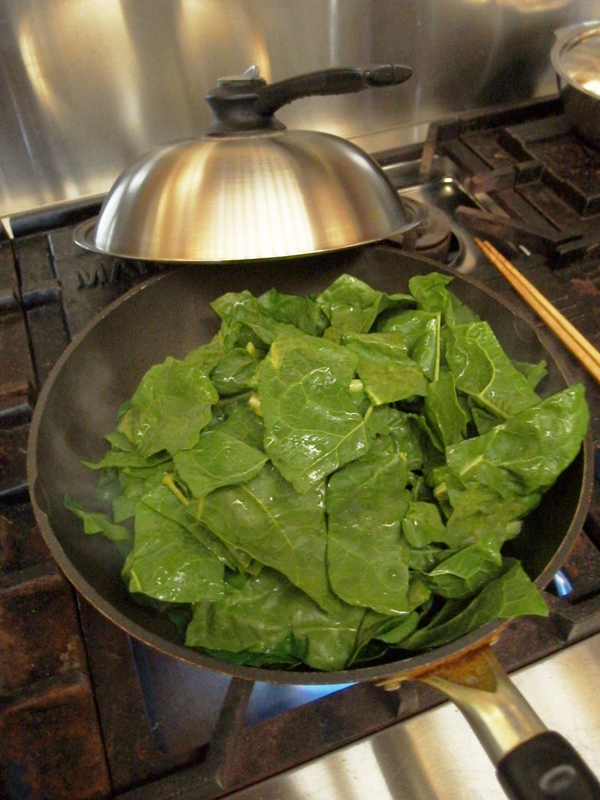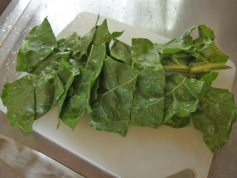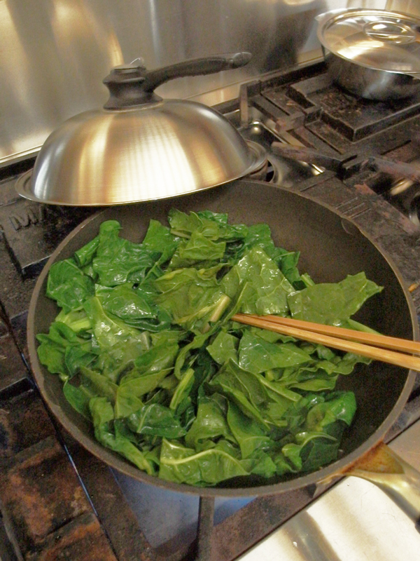 こんなに大きいのに柔らくてアクも少ないのです。私がよくするスイスチャードの食べ方は、手作りのブラジル風調味料 Tempero Mineiro で味をつけた炒め蒸し煮です。