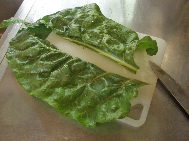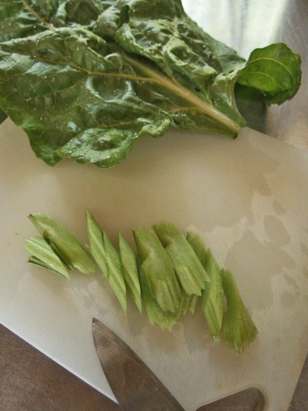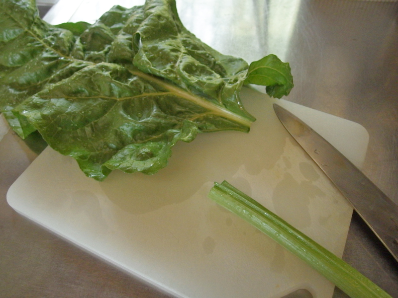 切り方にちょっと工夫がいります。 洗ったスイスチャードを先ず茎と葉を切り離します。