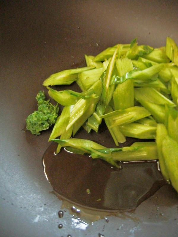 茎を入れた鍋に、太白胡麻油とTempero Mineiro を適量入れ、