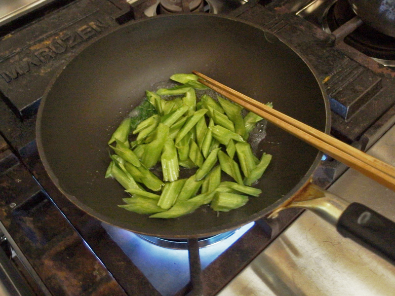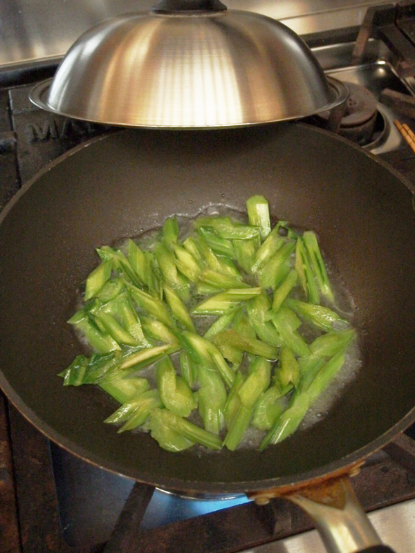 水を少し入れ、かき混ぜてから蓋をし、1分ほど蒸し煮したら、