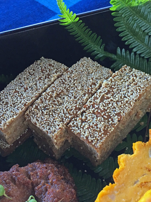 のし鶏:ソーセージ・パティの応用で作ってみました。香辛料を生姜にしお醤油と味醂で味をつけ、型に入れてオーブンで焼いた後、ケシの実をふりました。
