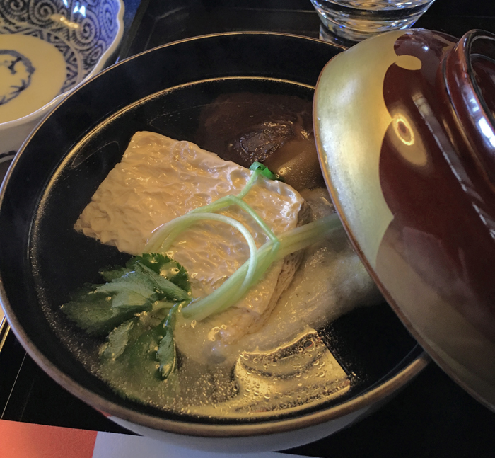 中身は・・・ 鶏の代わりのグルテンミートを出汁で煮てから焼いたもの、椎茸、三つ葉、柚子、それに焼き餅、澄まし汁は天然利尻真昆布ととっておきの大分の冬菇でとったお出汁、年に一度の極上の味でした。