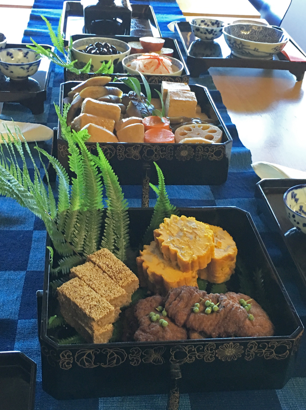 焼き物のお重です。 肉、魚、卵、なしのベジタリアン・バージョンなので、作るのが一番大変です。