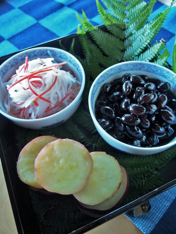 黒豆、水引なます、きんとんの代わりのさつま芋煮、口どりを入れたお重です。