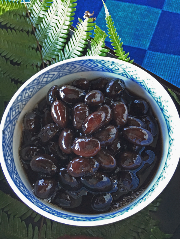 黒豆:丹波の黒豆の大粒を甜菜糖とグラニュー糖半々で、保温鍋で煮ました。