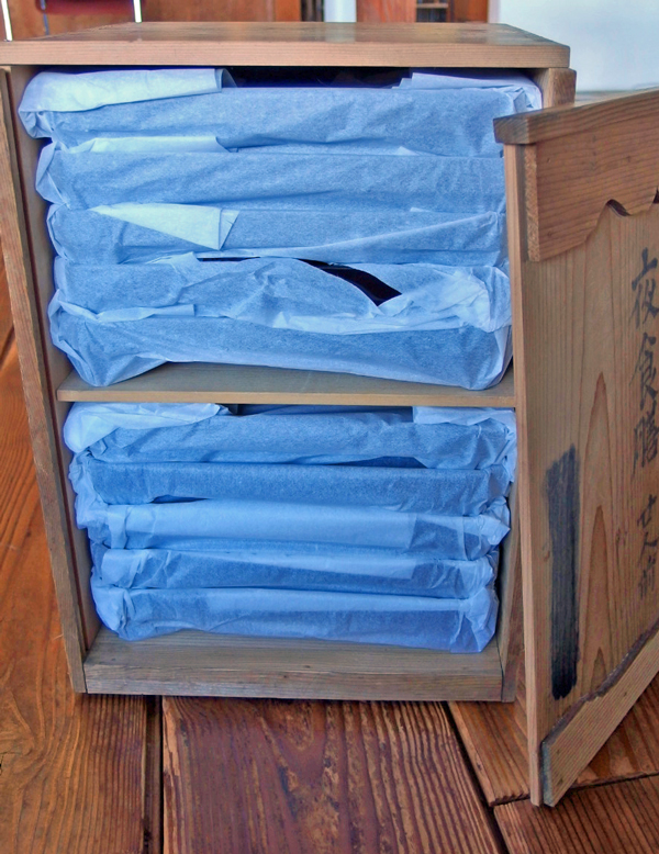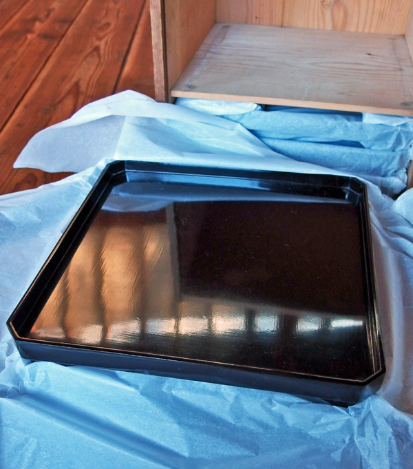 100年以上前のお膳が入った箱です。2箱あるうち一つは元旦の来客時に出して手入れしたのですが、もう一箱の方は10年以上使っておらず倉庫の奥に置きっぱなしでした。漆器は長い間使用せず乾燥しきってしまうと割れたり剥げたりしてしまいます。以前お屠蘇のセットを暫く使っていなかったら、見事に割れてしまったので、手入れしなければと気になっていたのです。
