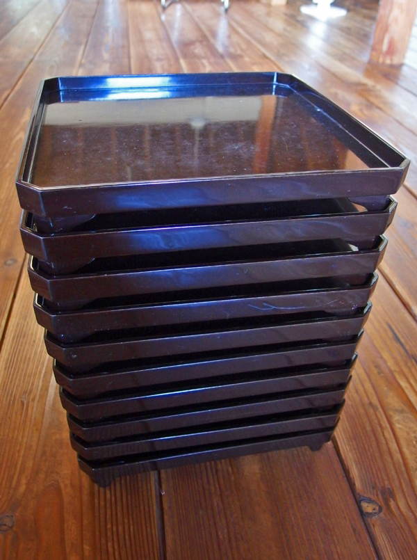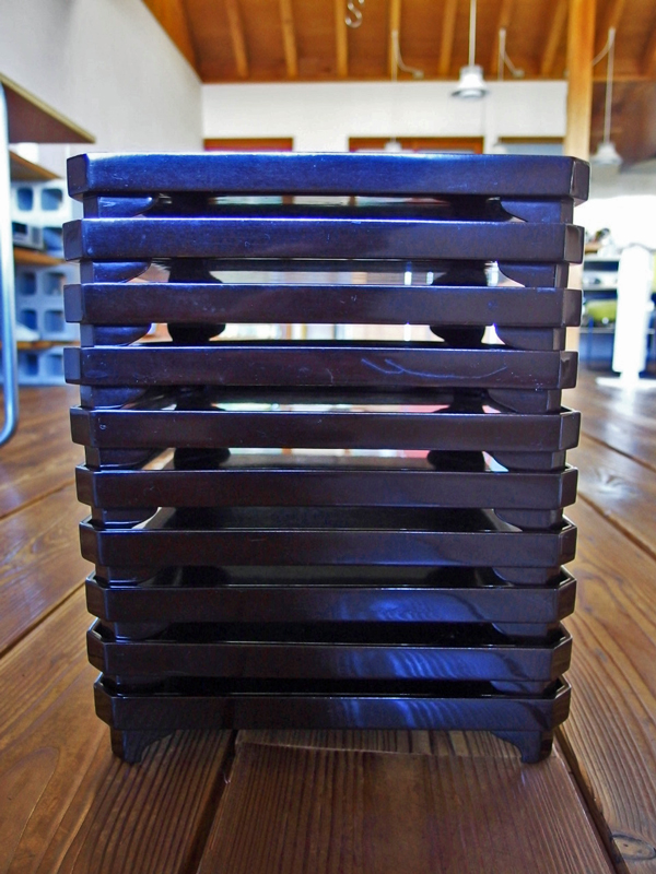 全部重ねてもガタピシせず、きっちりと納まります。昔は狂わないよい木材がまだあったのと、時間をかけてゆっくり作ったからなのでしょう。畳にこのお膳を置いて正座して食事をした人達は着物を着ていたのでしょう。