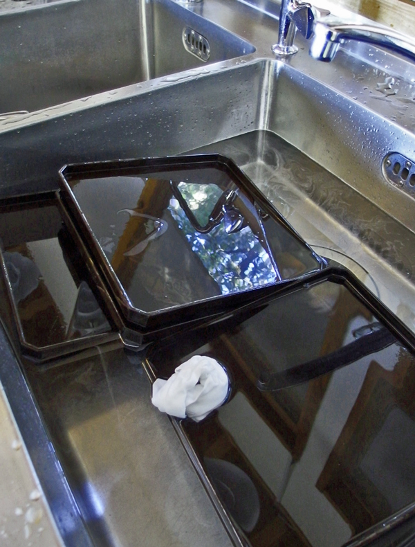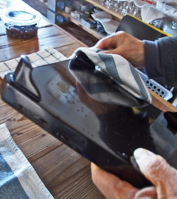 ぬるま湯で洗った漆器は、水切りカゴで自然乾燥させるのでなく、柔らかい布巾で丁寧に磨くように拭き上げます。昔は絹生地を使って更に磨いたと聞きましたが、私は木綿の布巾で拭くだけです。Mさんが手伝ってくれました。