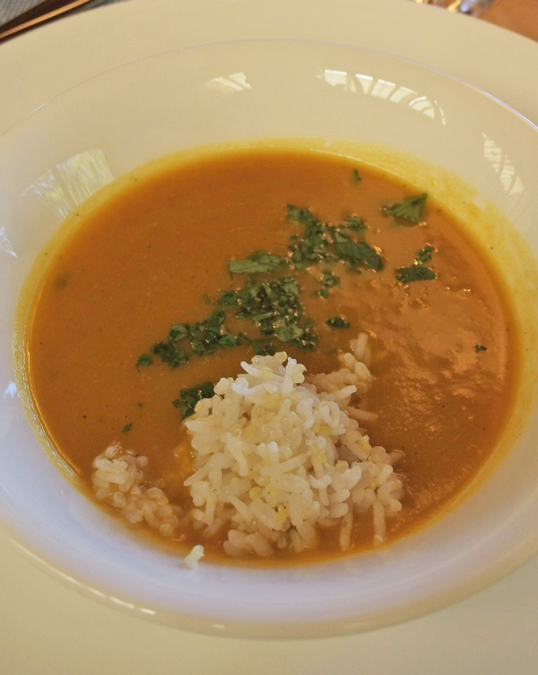 ここ1年以上私たちが特に気に入っているこの雑穀ご飯は、キヌア、キビ、ヒエか粟、それにバスマティライスが入った五分づき米のご飯です。そのサラサラ感とプチプチ感がスープにとてもあうのです。私達は以前はスープに玄米ご飯を入れていただいていたのですが、玄米ご飯はどうしても噛みたくなるので、スープに入れて食べるのがミスマッチな感じがしていました。この雑穀ご飯は口溶けがスープにとてもマッチするのです。