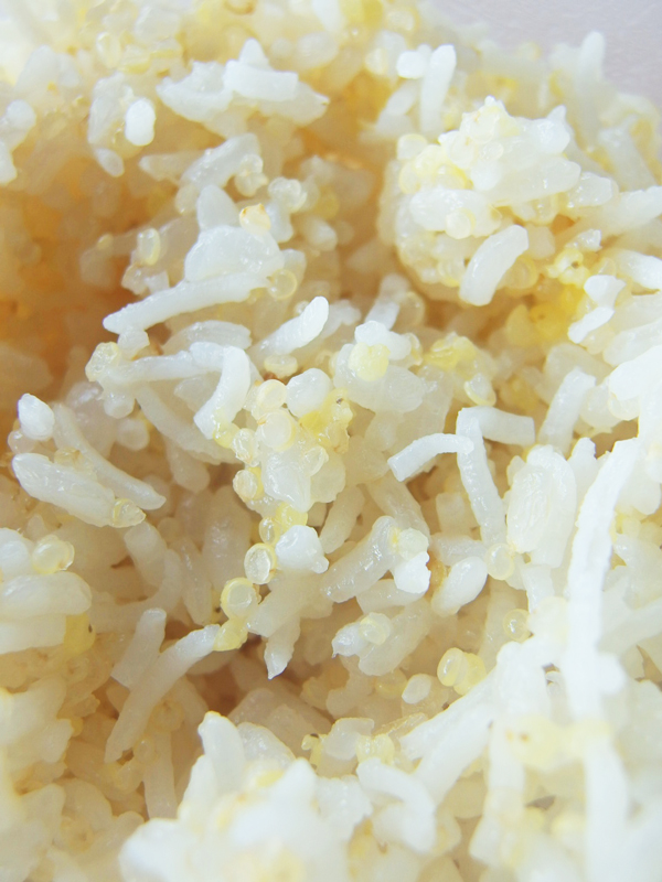 軽い長粒米バスマティ・ライスが上に浮いて炊き上がっています。キビの黄色が可愛らしいです。