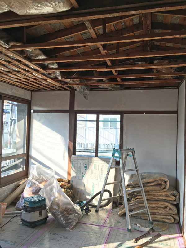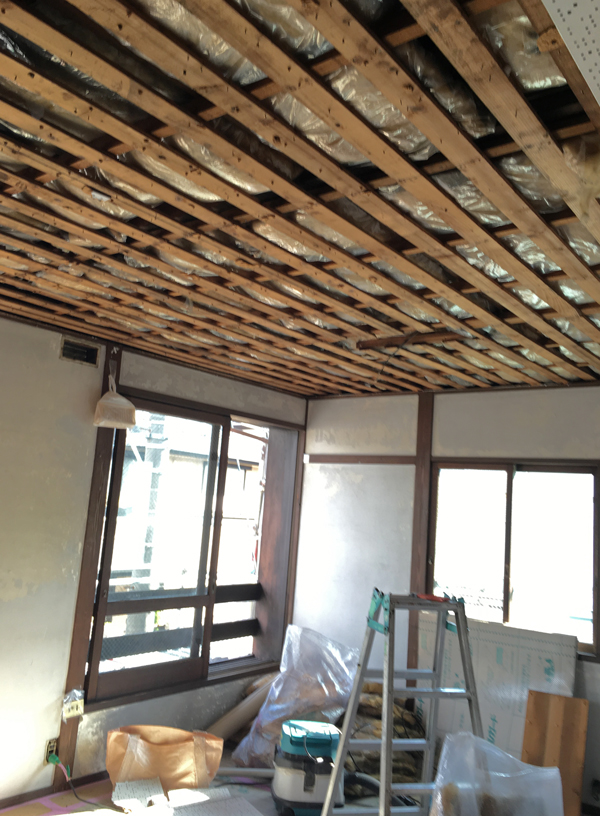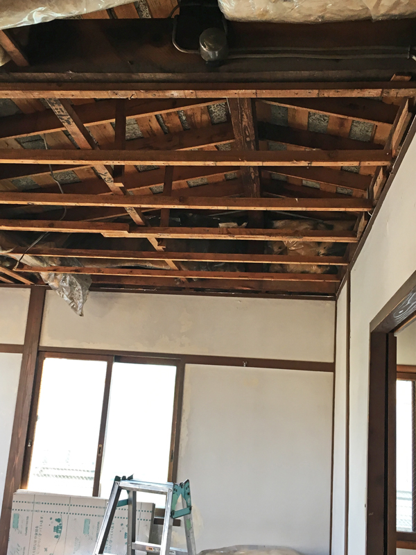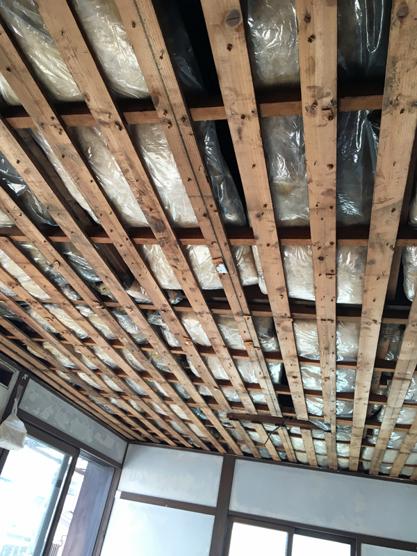 ボードを剥がすとこんな風になっていて、50年前のグラスファイバーの断熱材が天井裏に敷いてあるのが見えます。グラスファイバーを入れてあるビニールの袋が全然風化していないのが驚きでした。
