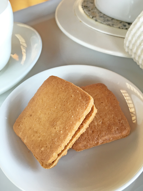 この小さなクッキー、伊東の滝沢製菓というお菓子屋さんで作っている「クリームサンド・クッキー」です。特別のクッキーではないのですが材料がシンプルで素朴な味で飽きがきません。
