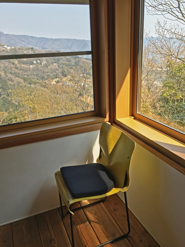 家の北東の角の窓辺、そこに置いた黄色い椅子。ここに座って景色を見ていると、鳥になったか飛行機に乗っているようで、気持ちや視点が日常から飛んで行くのです。