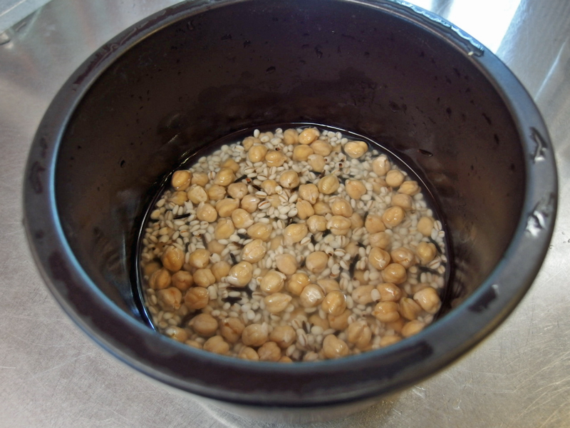 そしてボールに水を入れて2~3回水を取り替えて豆と雑穀を洗い、水を切り、そこへ40度くらいのお湯を注ぎ蓋をして5~6時間置きます。この浸水させてから圧力鍋で炊く方法は玄米ご飯と同じなので、小豆入り玄米ご飯を参考にしてください。
