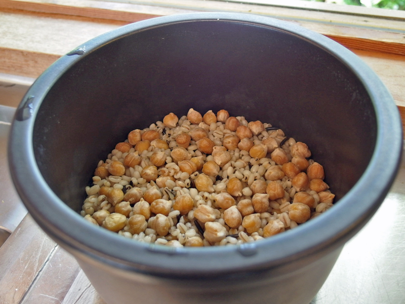 丸麦やはと麦は大きさはあまり変わりませんが、ひよこ豆はふっくら大きくなっています。