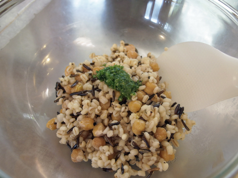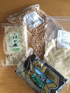 丸麦とはと麦、長いワイルドライス、コロコロのひよこ豆、このツブツブ感がサラダやスープに入れるとアクセントになって美味しいのです。私はジップロックケースにご飯のように分けて入れ、冷凍保存して必要な時電子レンジにかけて使っています。