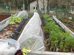 上の畑は標高が高くて冷え込むので、不織布を二重にかけて冬の寒さから守りました。枯れた部分もありましたが、布を開けると生き生きしたサラダリーフが一杯です。