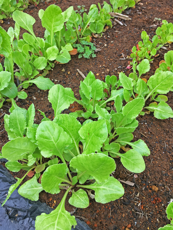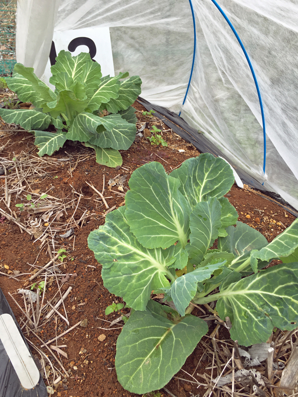 コラード・グリーン(無結球キャベツ)。 種が古くて駄目かもしれないと夏の終わりに適当に直播したのですが、立派に発芽してこのように元気になりました。私達が大好きなブラジルの豆料理「フェジョアーダ」に添える「コーベ・マンテーガ」に使います。