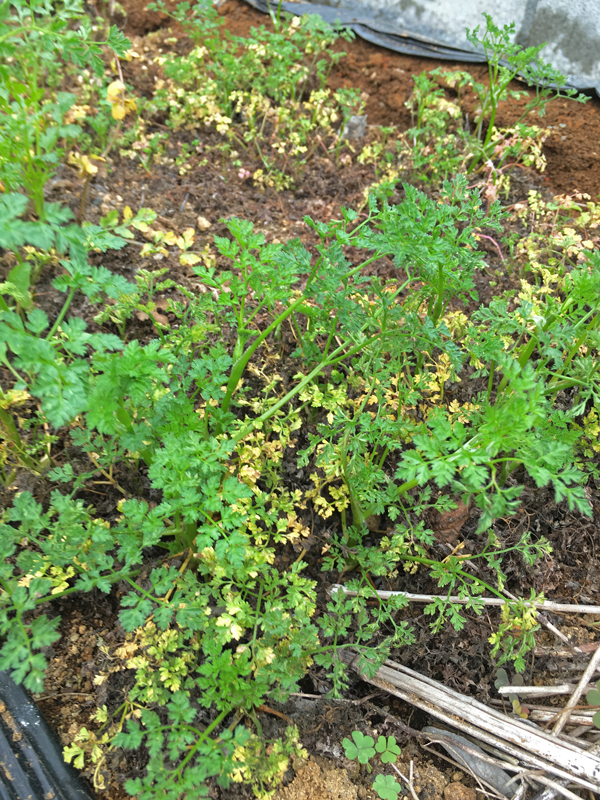 夏の終わりに播いた人参。 冬に収穫できるかもしれないと期待していたのですが、赤ちゃんのまま冬を超えて、収穫は今から1~2か月後になりそうです。