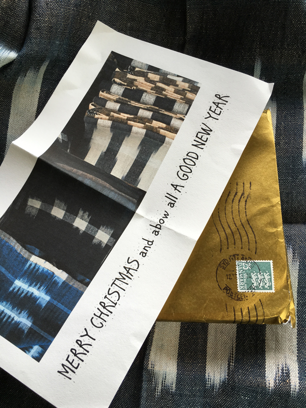 30年近く前に織物を通して知り合った Winnie Poulsen からのクリスマスプレゼント。 Present は Presence 「私はここに存在しています」の意。 Winnie のプレゼントはいつもそれが凝縮しているので、受け取るには心の準備が必要なのです。