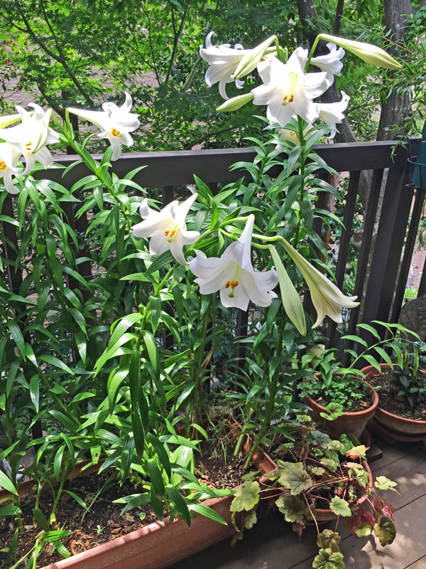 ユリが咲いています☆ プランターでこんなに立派なユリが咲くのです。Kさんのご主人は造園業、お花が好きなKさんは本業の女優をしながらご主人のお花部門を手伝うようになり今は専門家です。この日集まったのは8人、全員が揃ったテーブルは・・・