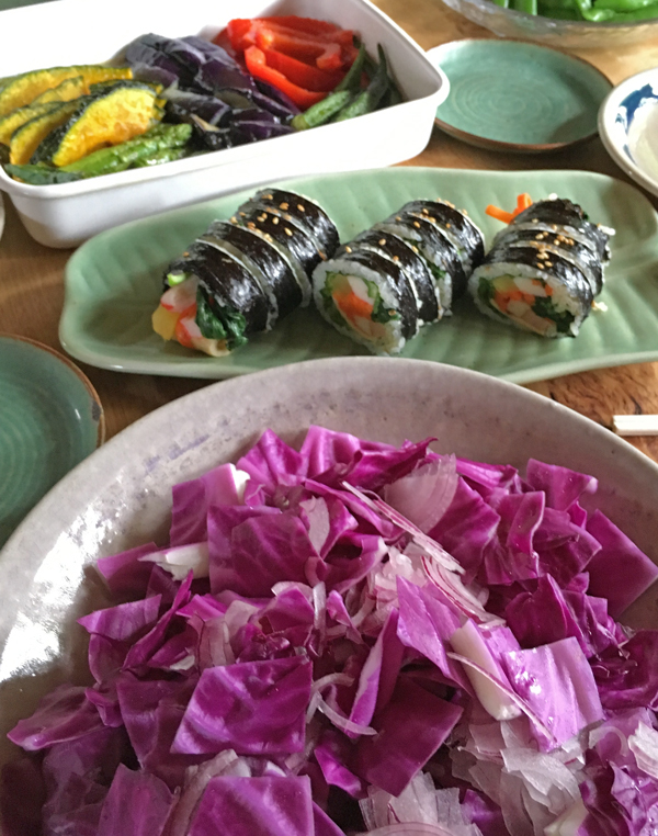 紫キャベツのサラダ、当時は美人の高校生、今も全然変わらないMakiさんの創作料理です。Makiさんはヨガで体調を整え、化粧水も自分で作っているそうです。それも全部独学でです。輝くほどの健康美!
