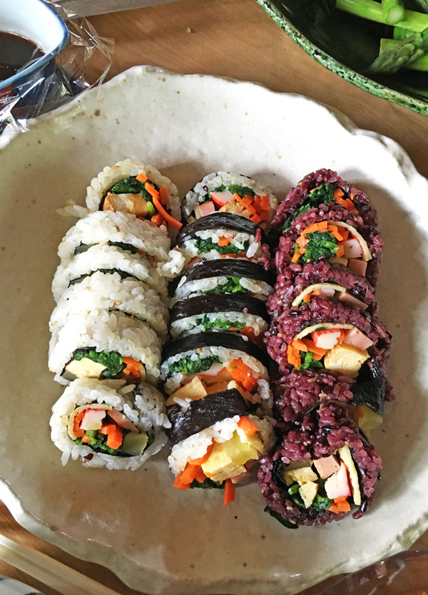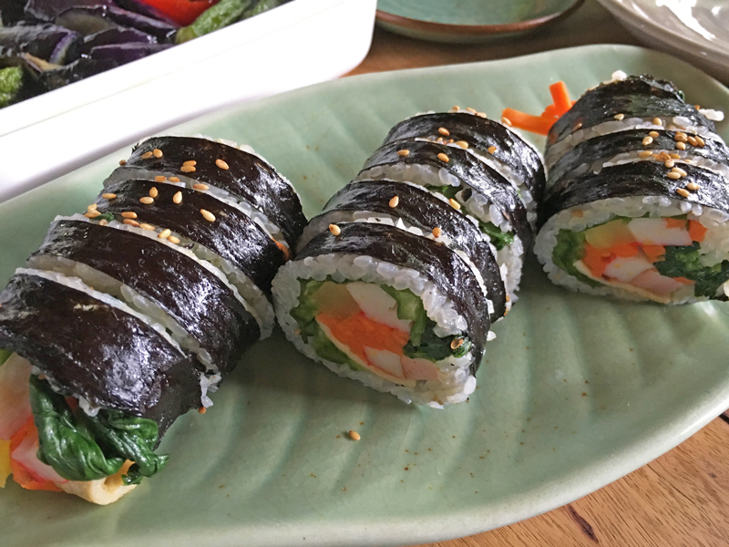 キンパ 韓国の海苔巻だそうです。Masakoさんが特に選んで持って来て下さいました。私はこのキンパという海苔巻をこの時初めて知りました。私のためにベジタリアンのキンパをわざわざ別に買って来てくださいました。