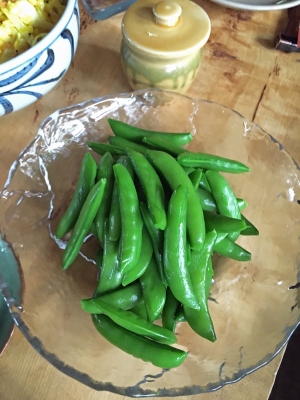 シーズン最後のスナップエンドウの塩ゆでです。私が育てたエンドウです。