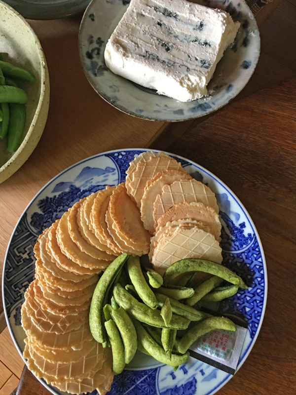 イタリアのゴルゴンゾーラとマスカルポーネのディップ。行くと欲しくなるのでなるべく行かないようにしているチーズ屋さんのお薦め、と、Tさん。 クラッカーの下の青いものはそのまま食べられるドライのスナップエンドウです。知りませんでした。