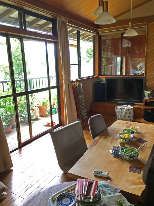 二階のダイニングルームの大きなテーブルの上には、もう持ち寄りのお料理が並びかけていました。窓の外のテラスには植物が一杯です。