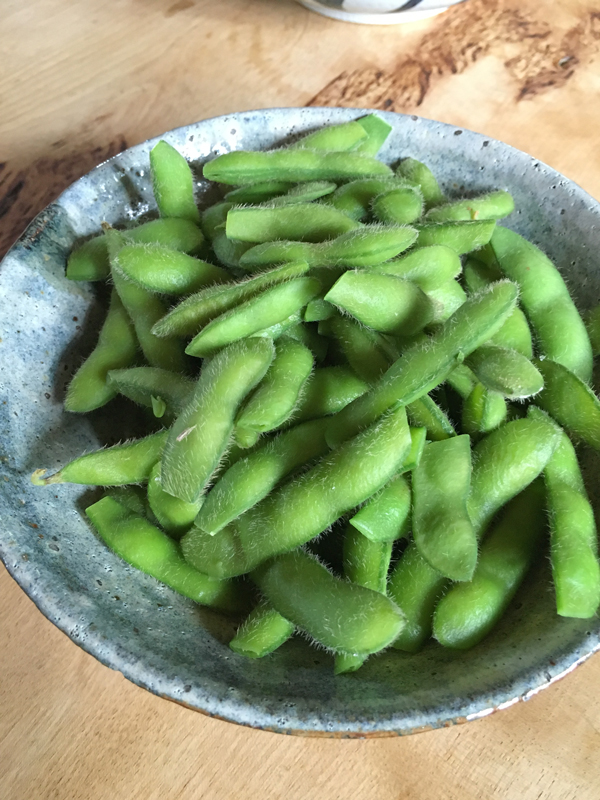 美味しそうに茹であがった枝豆、本当は枝豆入りのお寿司ご飯にする予定だったのが、ご飯が柔らく炊き上がってお寿司向きでなくなったので、枝豆だけになりました、と、Kさん。