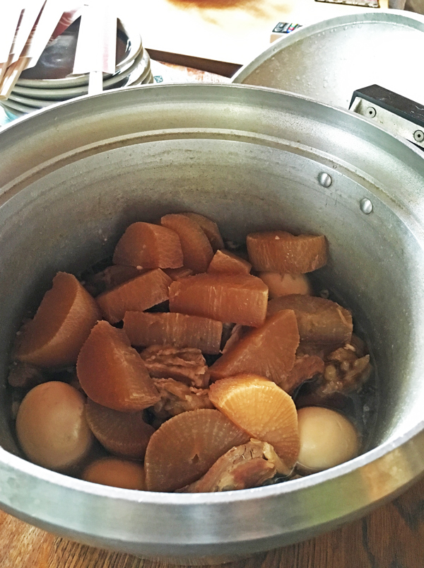 年代物のアルミ鍋の中は、大根、筋肉、茹で卵の煮込み です。このお鍋は、Kさんが20年以上前に中華料理の先生から頂いたものだそうです。その先生はこの鍋を長く愛用していたという年季の入ったお鍋です。