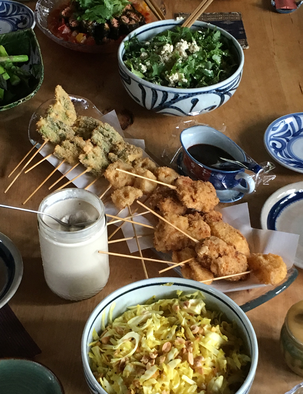 蓮根、オクラ、玉ネギ、豚肉、の串揚げ。Kさんが揚げたてを振る舞って下さいました。