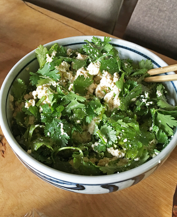 パクチーの白和え。事前にパクチーの苦手な人はいますか?と、お知らせがありました。雑誌の編集長としてとても忙しいのに今回も動いてくれたOさんのお料理です。