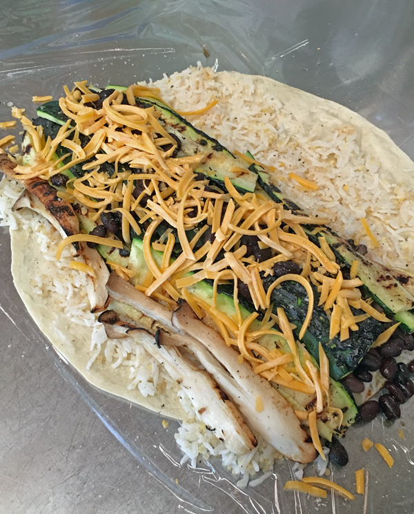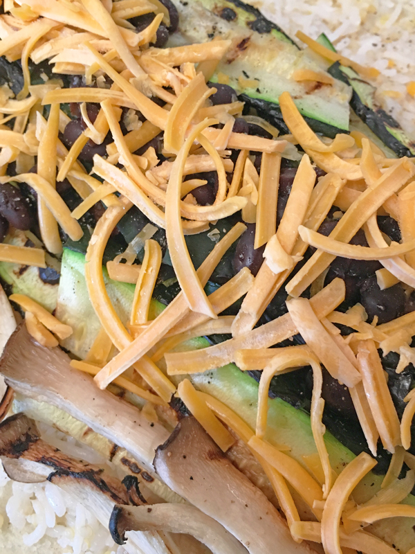 ラップの上に冷凍してあったトルティーリャをフライパンで温めてからのせ、その上に雑穀ご飯を広げ、残り物のカレーと豆の煮たのを少し煮て水分を飛ばしてのせ、その上に網焼きしたズッキーニとエリンギ、ピザチーズ、