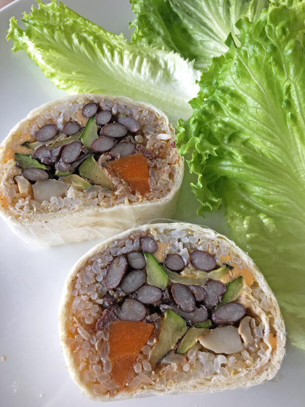 私の留守中のMさんの食事用に、野菜中心のカレーとブラジル風豆の煮込みを鍋一杯作って冷蔵庫に入れておきました。今週お客様があるので冷蔵庫のスペース確保も兼ねて、残りものを入れたブリトー風巻物を作りました。