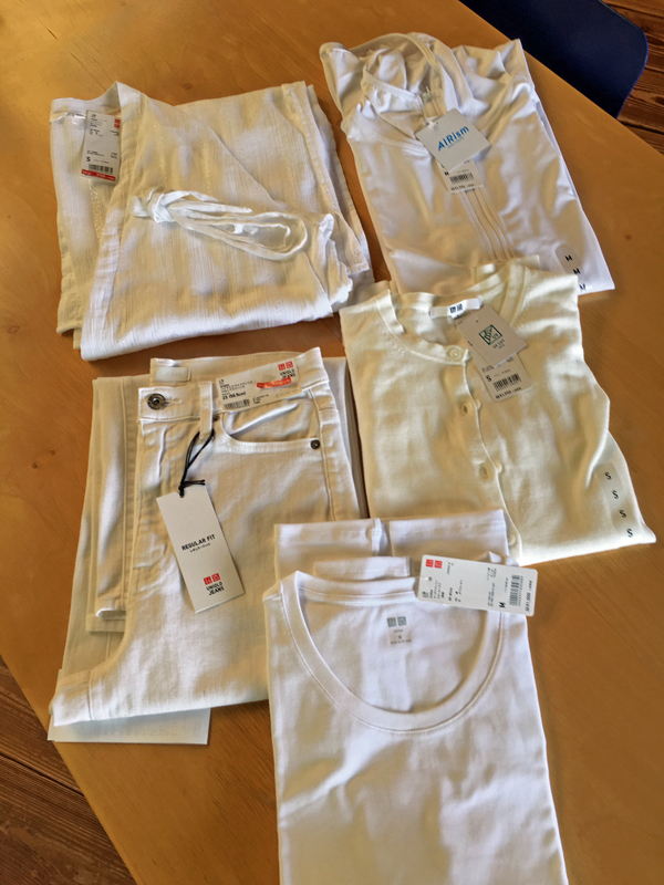 他の色と合わせやすい、汚れが目立たない、という理由から私は黒の衣類が多いので、大至急伊東のユニクロへ白い服を買いに行きました。夏も終盤で種類もサイズも少なかったのですが、何とか探したのが上の5点です。