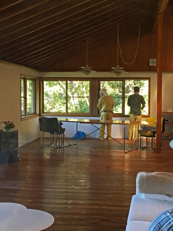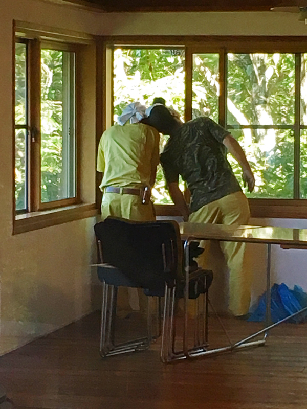 スタッフが見上げている窓の上部、雨戸の鴨居に、今度はアシナガ蜂が沢山集まって固まりになっているのを、その隣の窓を拭いていて発見したのです。また刺されたら大変、直ぐ管理事務所に連絡して駆除して頂いたのですが、不思議な事にそこに巣はなく、蜂だけが沢山集まっていたのでした。
